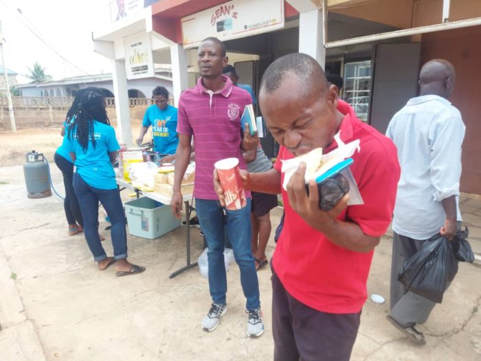 We organize food (egg sandwich with hot chocolate) and share it to passerby on the street. We get